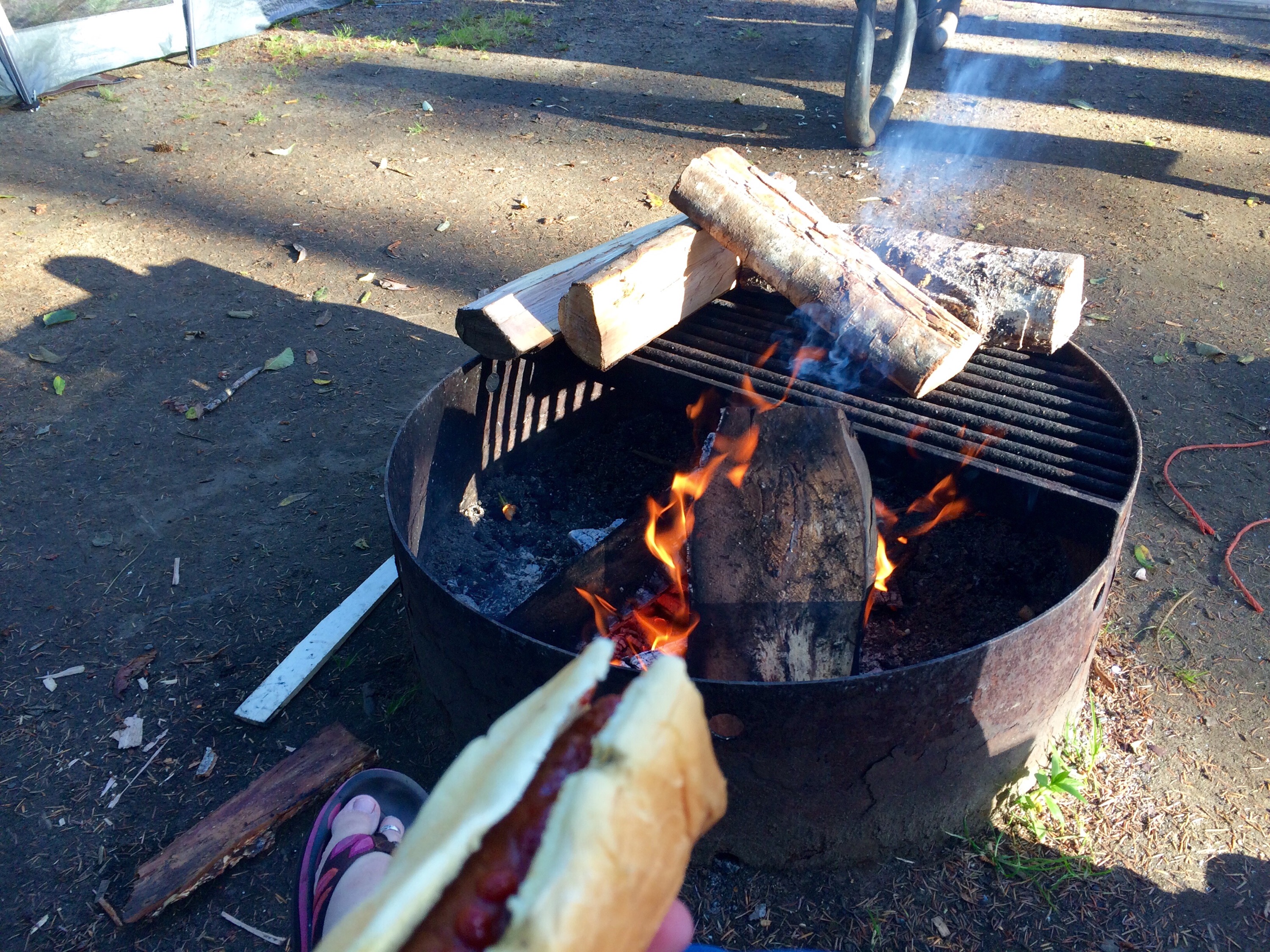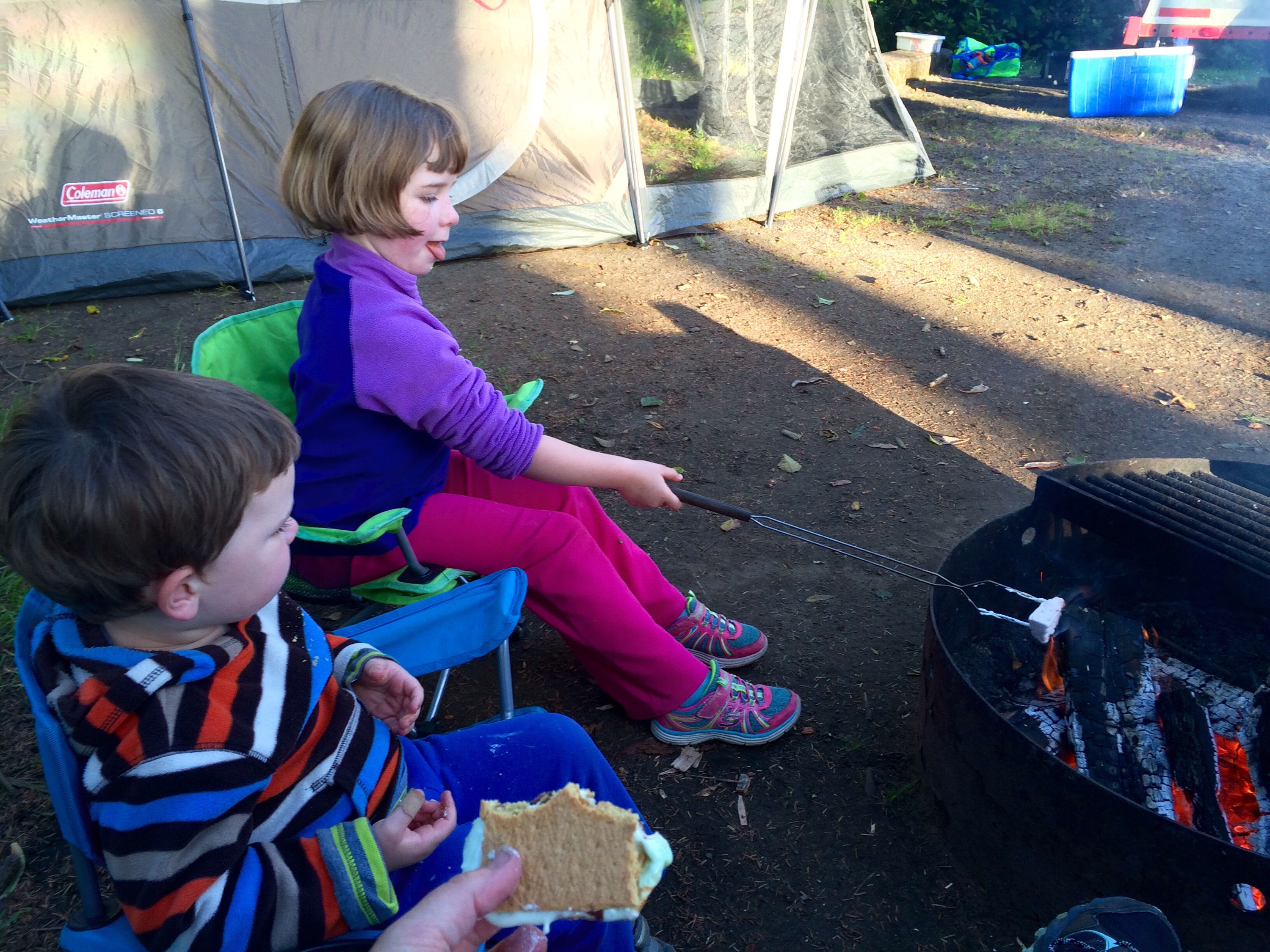 campfire dress rehearsal the child loves throwing sandhead down “Amelia!” “What?”“Cheese!” how to best spend a friday afternoonchillaxing by the fire weenie roastTom’s serious about camping roasting marshmallowsis it done? glowstick party in the trailer!baby rave
