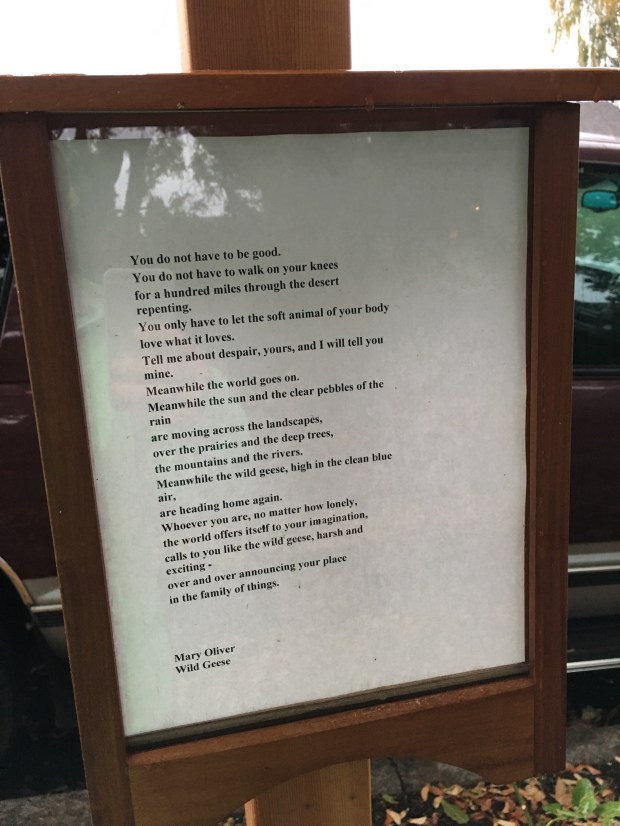 Somewhat related, yesterday on our walk to school (well our walk-partway-to-school) I saw this poetry post with my favorite Mary Oliver poem in it.