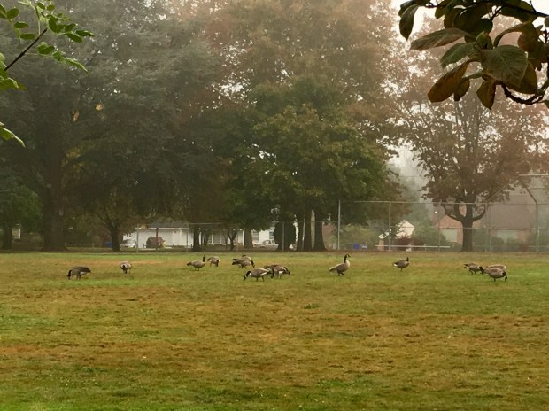This flock of geese hangs out in the local elementary school baseball/soccer field, most mornings. I wonder if any of the kids in the classrooms that overlook this field stare out the window at them.